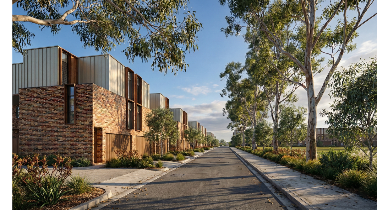 A narrow contemporary home set within a coastal Melbourne suburb, its architecture balances raw materiality and soft natural expression. Concrete planes and bold contemporary forms create a sculptural, minimalist presence, contrasted by lush, layered vegetation that softens the façade and grounds the building within its landscape.